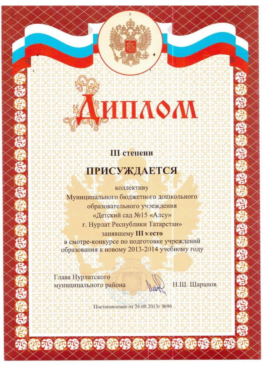 Диплом за III место в смотре-конкурсе по подготовке к новому 2013-2014 учебному году