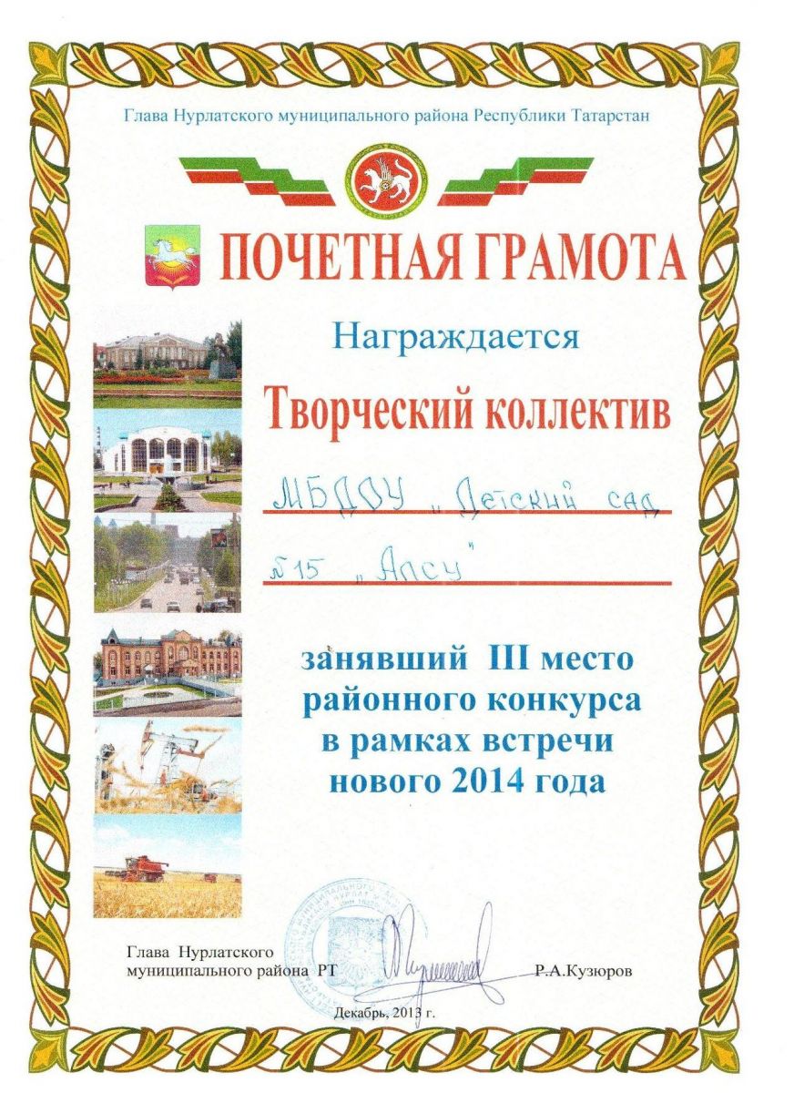 Почетная грамота за III место районного конкурса в рамках встречи нового 2014 года