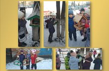 Балалар әти-әниләре белән кошлар өчен җимлекләр ясадылар һәм агачларга элделәр.