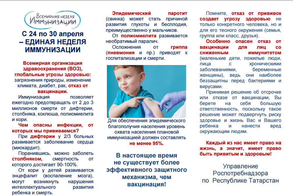 Опубликовано: 25.04.2022В соответствии с Планом Роспотребнадзора в Российской Федерации, в том числе в Республике Татарстан, проводится Единая неделя иммунизации с 24 по 29 апреля 2022 года.
