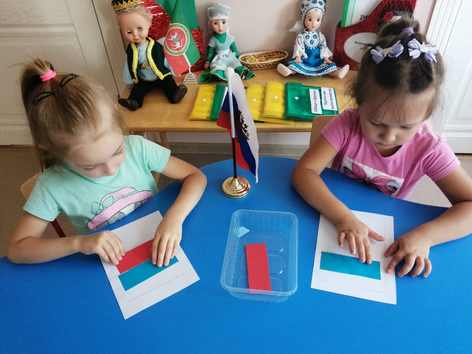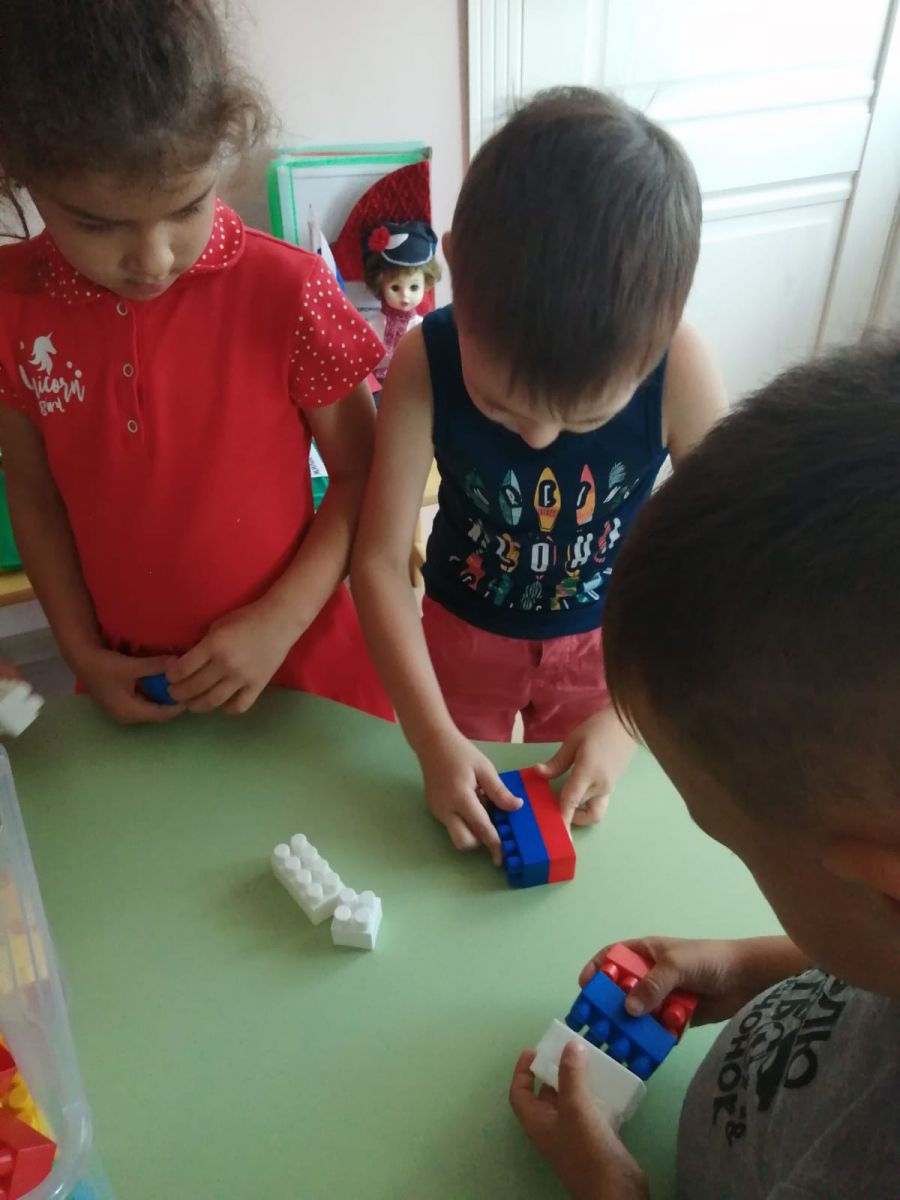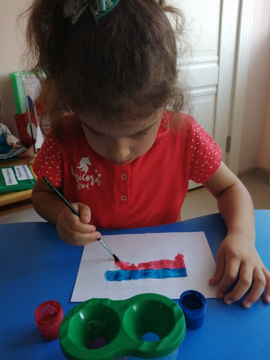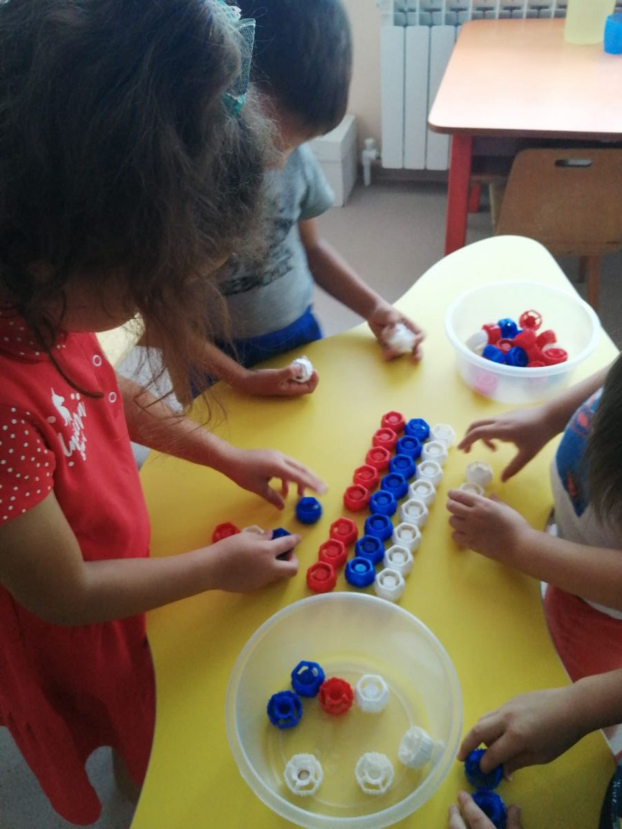 Бүген Россия Дәүләт флагы көнендә урта төркем балалары белән төрле чаралар үткәрелде: "Россия әләмен җый" темасына легодан конструкцияләү, "Флагны буяу" темасына рәсем ясау, "Россия әләмен сал" фрутоняня капкачлары белән үстерүче уен.