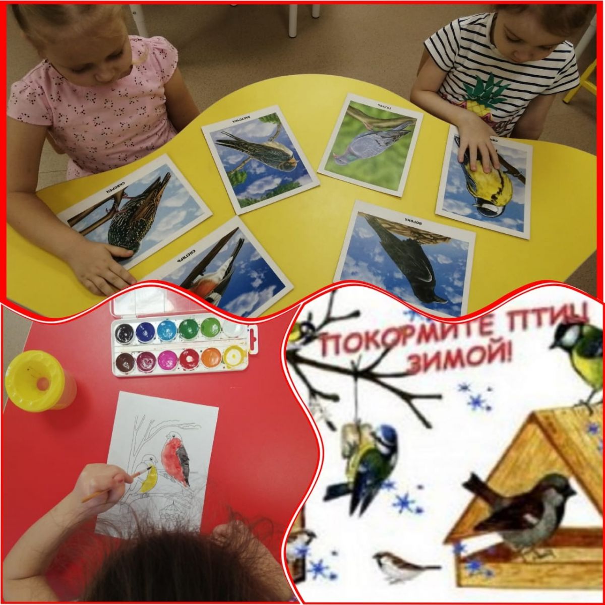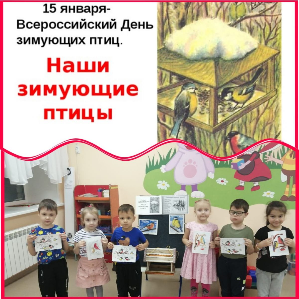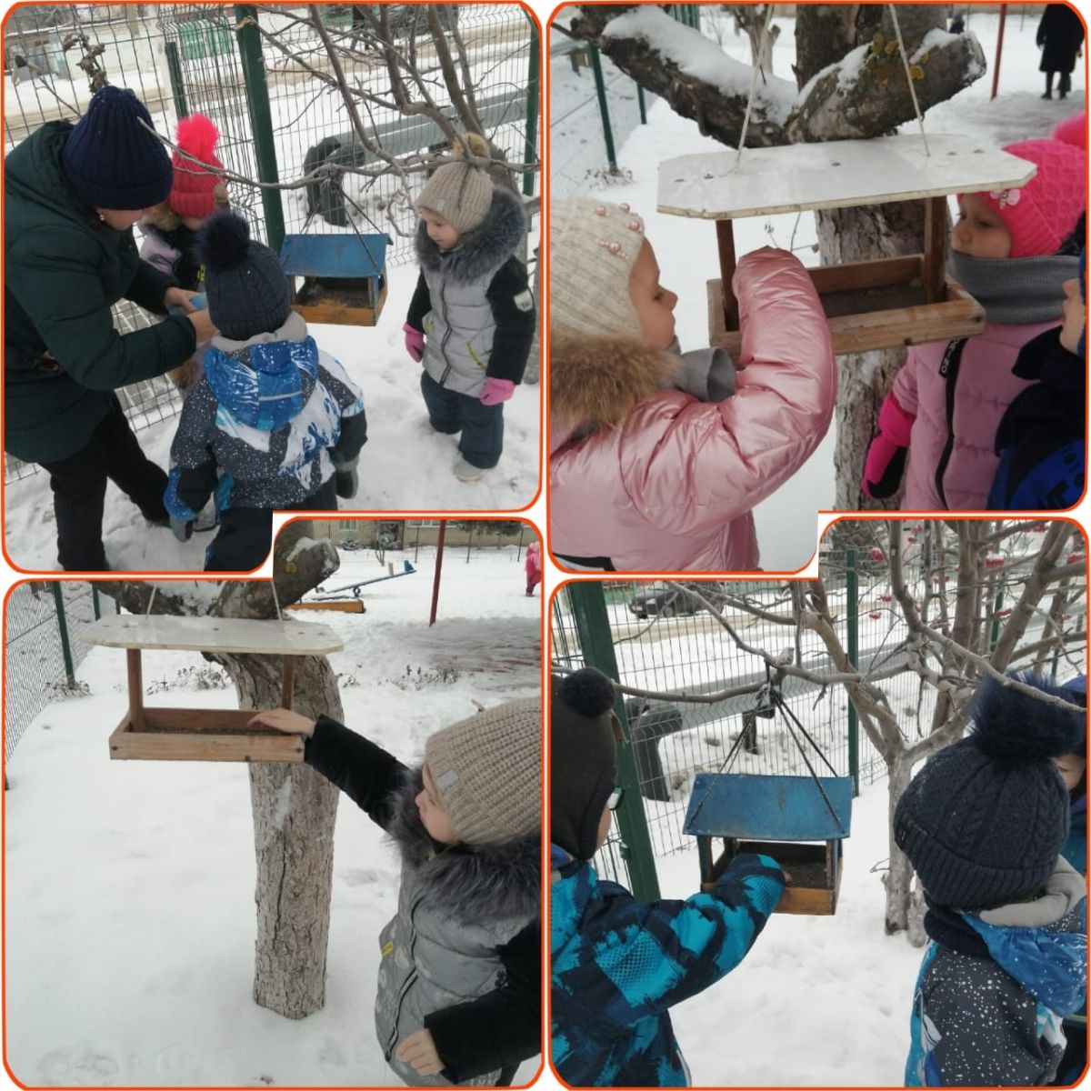 Ел саен 15 гыйнварда "Кышлаучы кошлар көне" Бөтенроссия экологик бәйрәме үткәрелә. Тәрбиячеләр, өлкән төркем балалары белән берлектә, бу көнгә багышланган төрле чаралар үткәрделәр. Җәяү йөргәндә балалар җимлек янына килгән кошларны күзәттеләр, балалар белән тулган бөртекләрне яла ягтылар. Төркемдә тәрбиячеләр "Кышын кошларны ашатыгыз" дигән темага әңгәмә уздырдылар, "Тасвирлама буенча уйлан" дидактик уены уйнадылар, балалар "Кышлаучы кошлар" темасына буяулар буядылар.