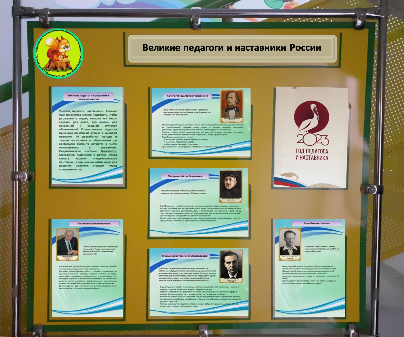 Педагог һәм остаз елы кысаларында балалар бакчасында педагоглар белән «Күренекле педагоглар һәм остазлар» темасына тематик чаралар узды. Укытучылар һәм остазлар — һәр җәмгыятьнең нигезе. Укытучы үзенең тәрбияләнүчесен нинди күнекмәләргә өйрәтәчәк, ул шундый булачак. Педагоглар бөек педагоглар һәм остазлар турында искә төшерделәр. Вакытлар үзгәрә, элеккеге укыту ысуллары урынына яңа технологияләр килә. Ләкин төп максат элеккечә кала - киң фикер йөртә һәм үз карарларын кабул итә алган якты максатчан шәхес тәрбияләү. Шулай ук «Россиянең бөек педагоглары һәм остазлары» стенды рәсмиләштерелде.
