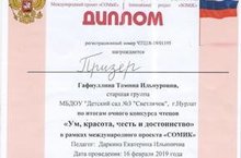 16 февраля 2019 года в МБОУ «СОШ №1» в рамках Международного проекта «СОМИК» состоялся очные конкурсы: чтецов «Ум, честь, красота и достоинство» и "Приключения чисел и фигур". Воспитанница старшей группы Гафиуллина Тамина Ильнуровна стала призером и была награждена дипломом, воспитанник старшей группы Галиев Данияр стал участником международного проекта "СОМИК" в номинации "Приключения чисел и фигур".