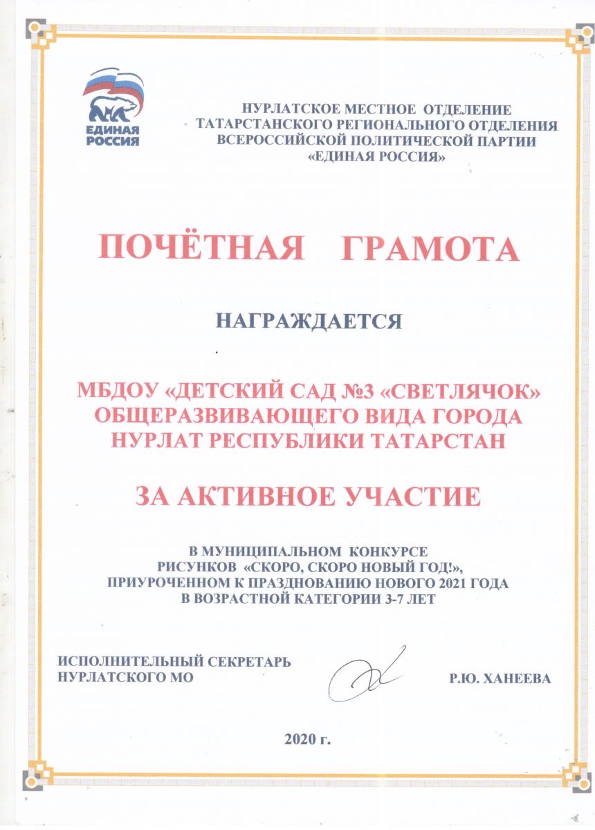Почетная грамота за активное участие в муниципальном конкурсе рисунков "Скоро, скоро, новый год"
