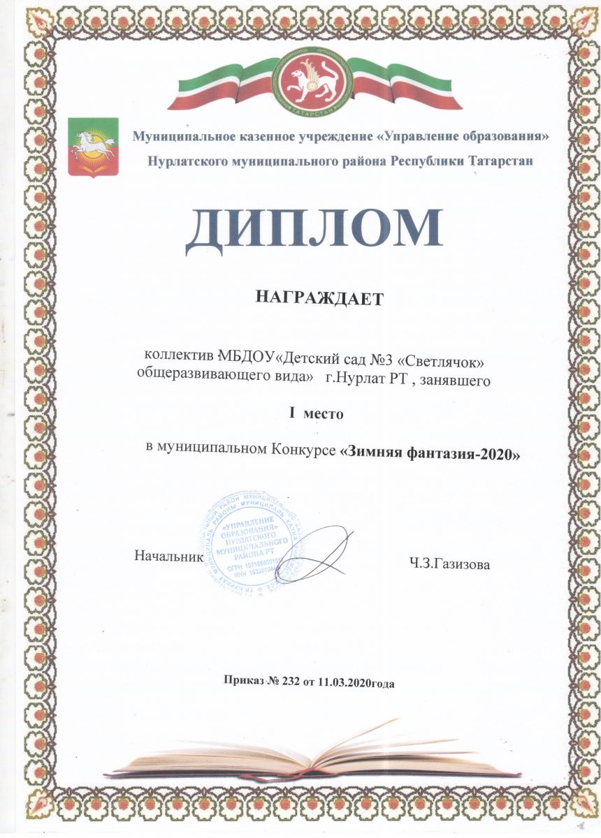 Диплом за 1 место в муниципальном Конкурсе "Зимняя фантазия 2020"