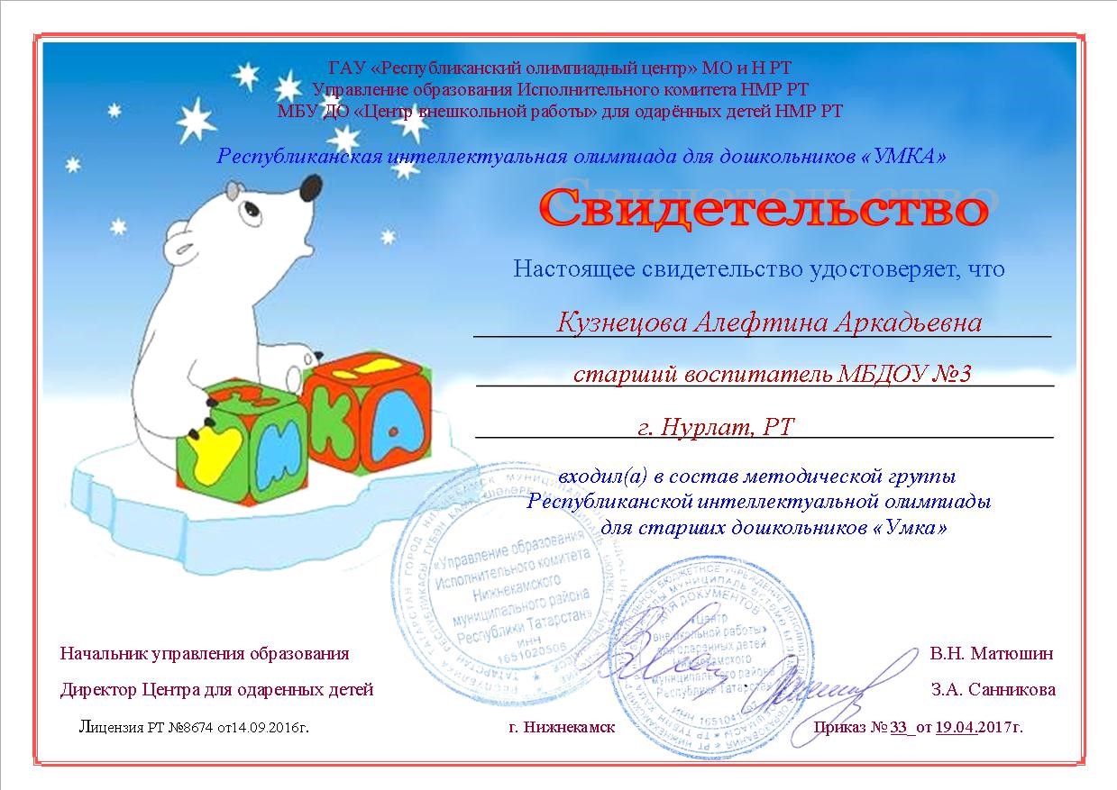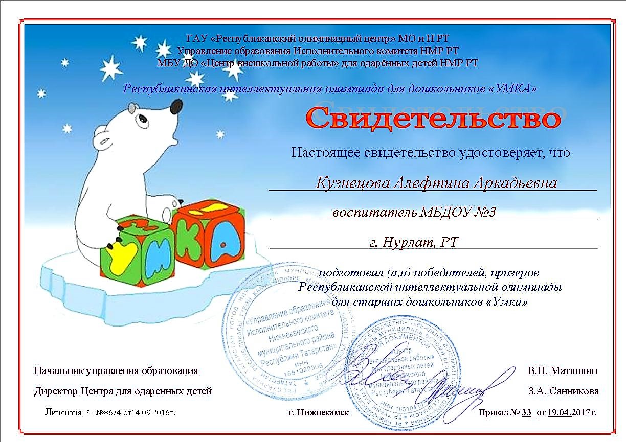 Алефтина Аркадьевна Кузнецова воспитатель - подготовила призёров олимпиады УМКА