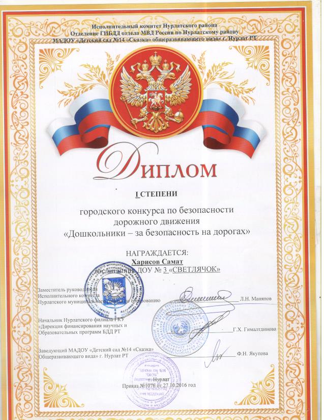 Диплом 1 степени в конкурсе города «Дошкольники – за безопасность на дорогах»- Харисов Самат; 2016г/ «Мәктәпкәчә яшьтәге балалар – юлларда иминлек өчен » исемле шәһәр конкурсында - Харисов Самат 2016 елны 1 дәрәҗә дипломына лаек булды