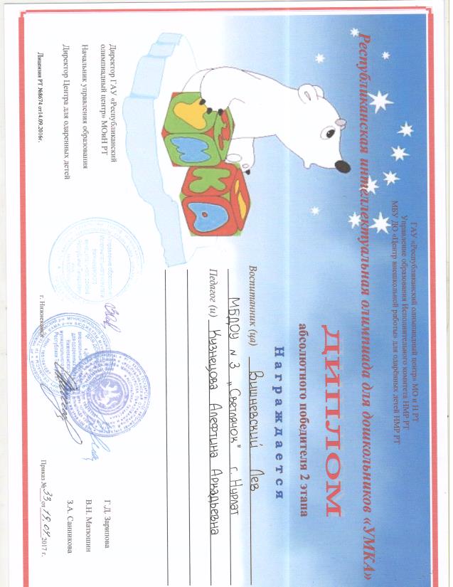 Диплом абсолютного победителя 2 этапа республиканского конкурса "УМКА" - Вишневский Лев; 2017г. / 2017г. / 2017 елның 2-нче этап Республика "УМКА" конкурсында абсолют җиңүче дипломына - Вишневский Лев лаек булды