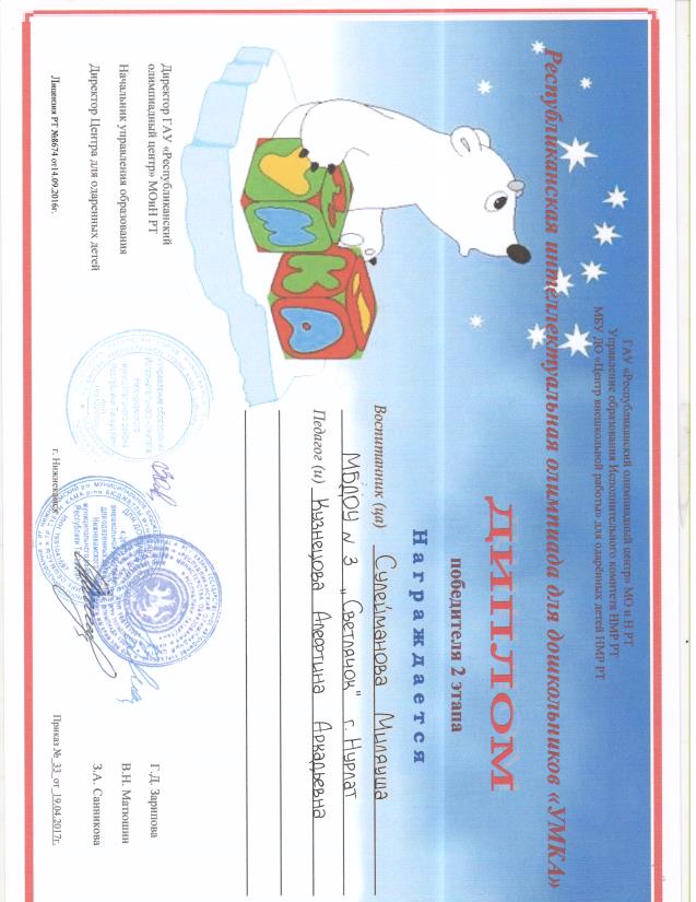Диплом победителя 2 этапа республиканского конкурса "УМКА" - Сулейманова Миляуша; 2017г. / 2017г. / 2017 елның 2-нче этап Республика "УМКА" конкурсында җиңүче дипломына - Сулейманова Миляуша лаек булды