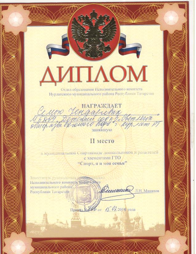 Диплом за 2 место в спортакиаде "Спорт, я и моя семья"- Чендарев Вадим - 2018г. / "Спорт", "мин һәм минем гаиләм" спартакиадасында Чендарев Вадим 2 нче урын дипломына лаек булды.