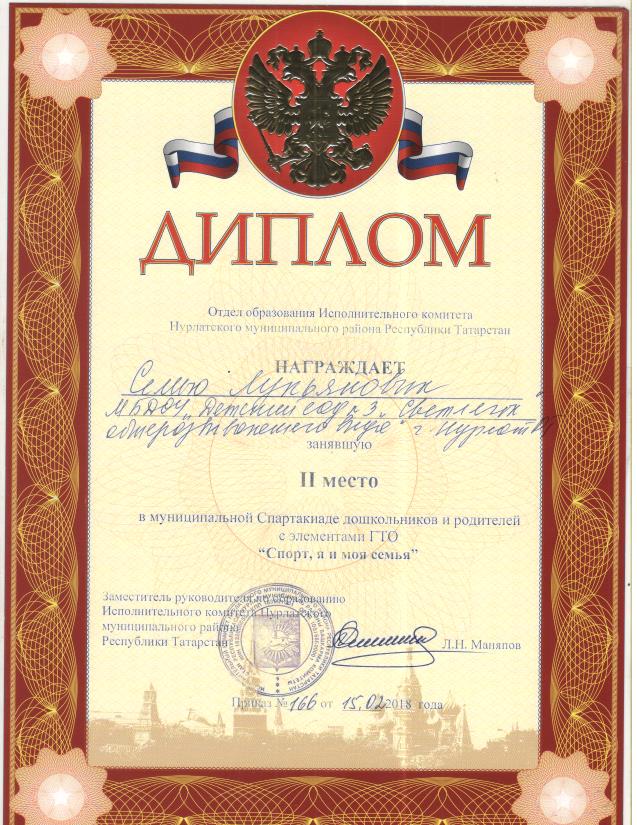 Диплом за 2 место в спортакиаде "Спорт, я и моя семья"- Лукьянова Ульяна - 2018г. / "Спорт", "мин һәм минем гаиләм" спартакиадасында Лукьянова Ульяна 2 нче урын дипломына лаек булды.