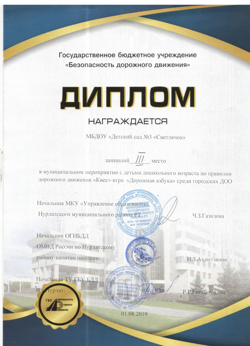 Диплом за 3 место в муниципальном мероприятии по правилам дорожного движения квест-игра "Дорожная азбука"2019 год./ 2019 елда "Юл әлифбасы"квест-уены юл хәрәкәте кагыйдәләре буенча муниципаль чарада 3 урын өчен диплом.