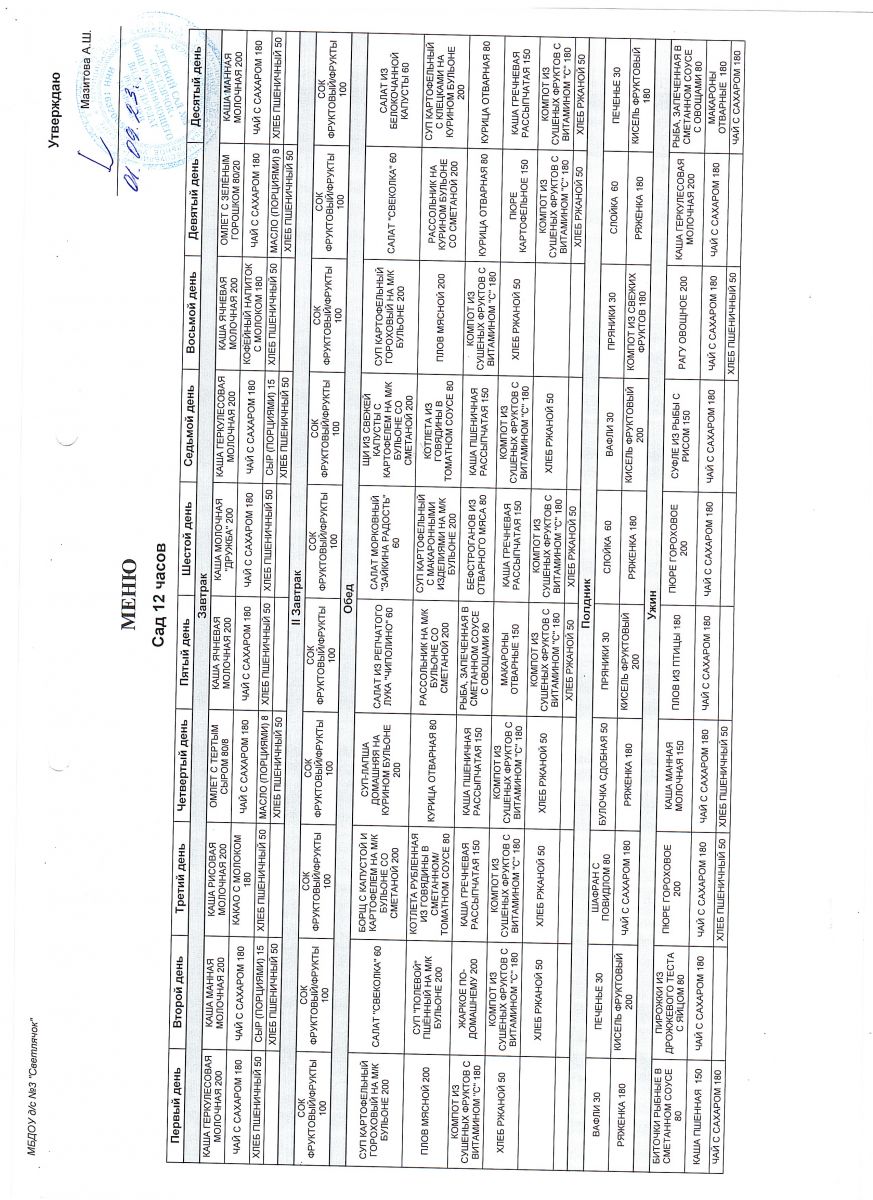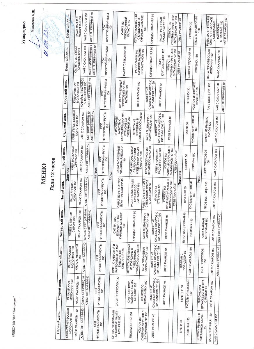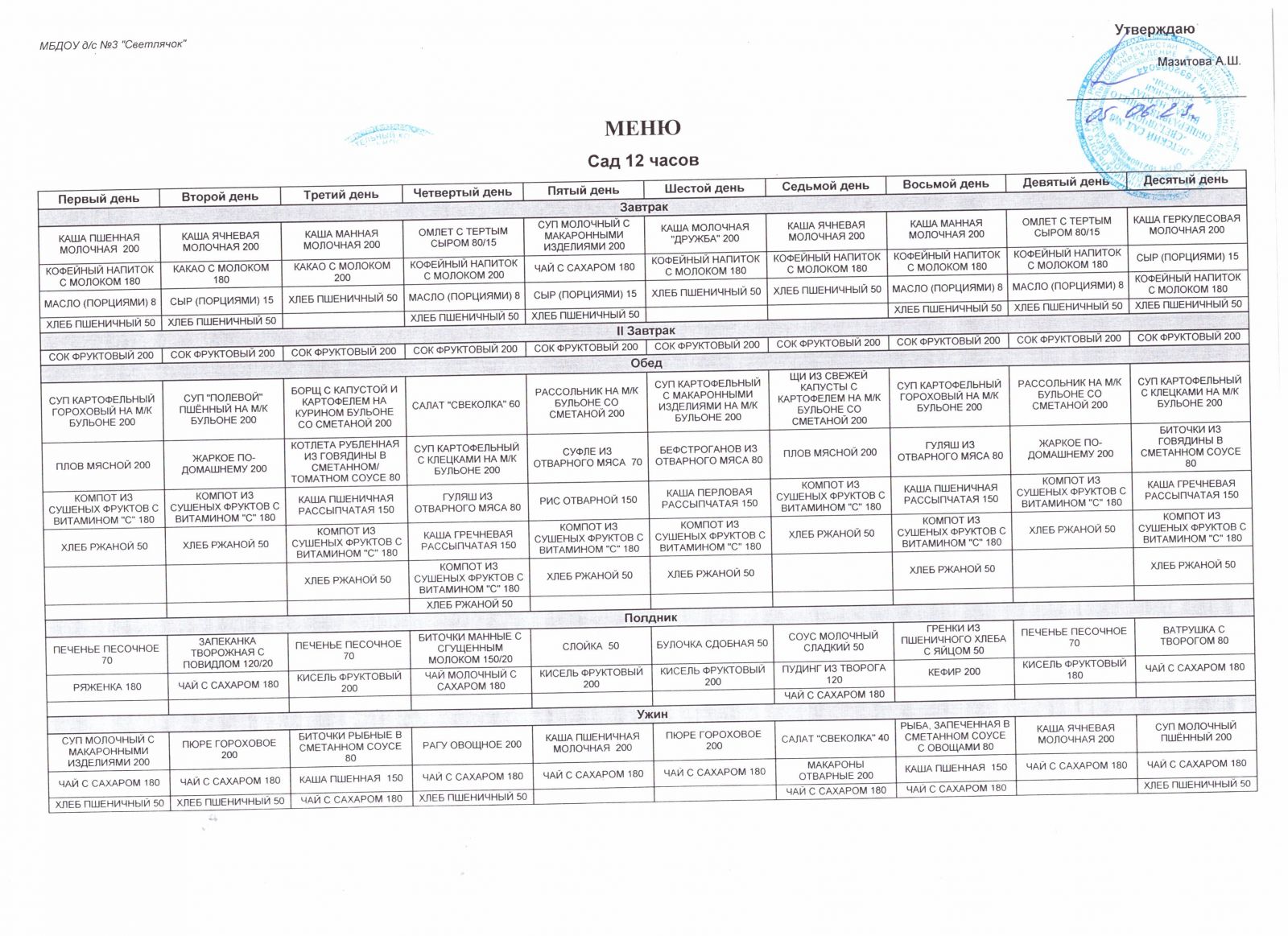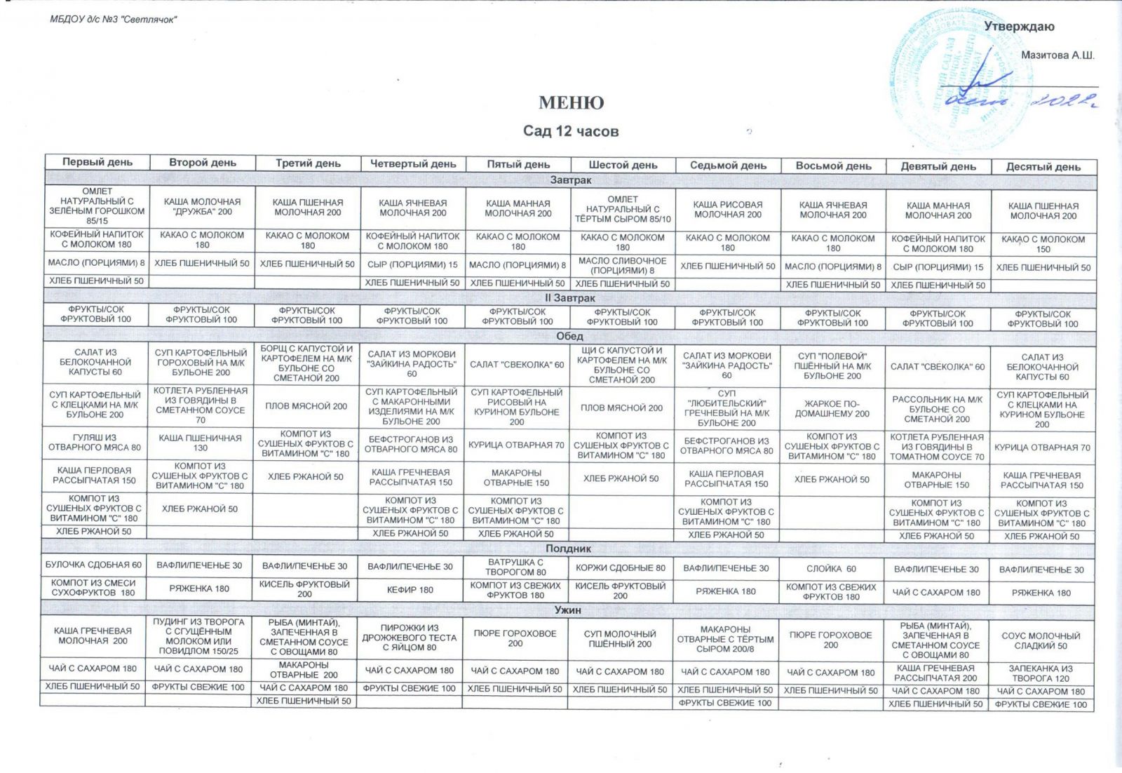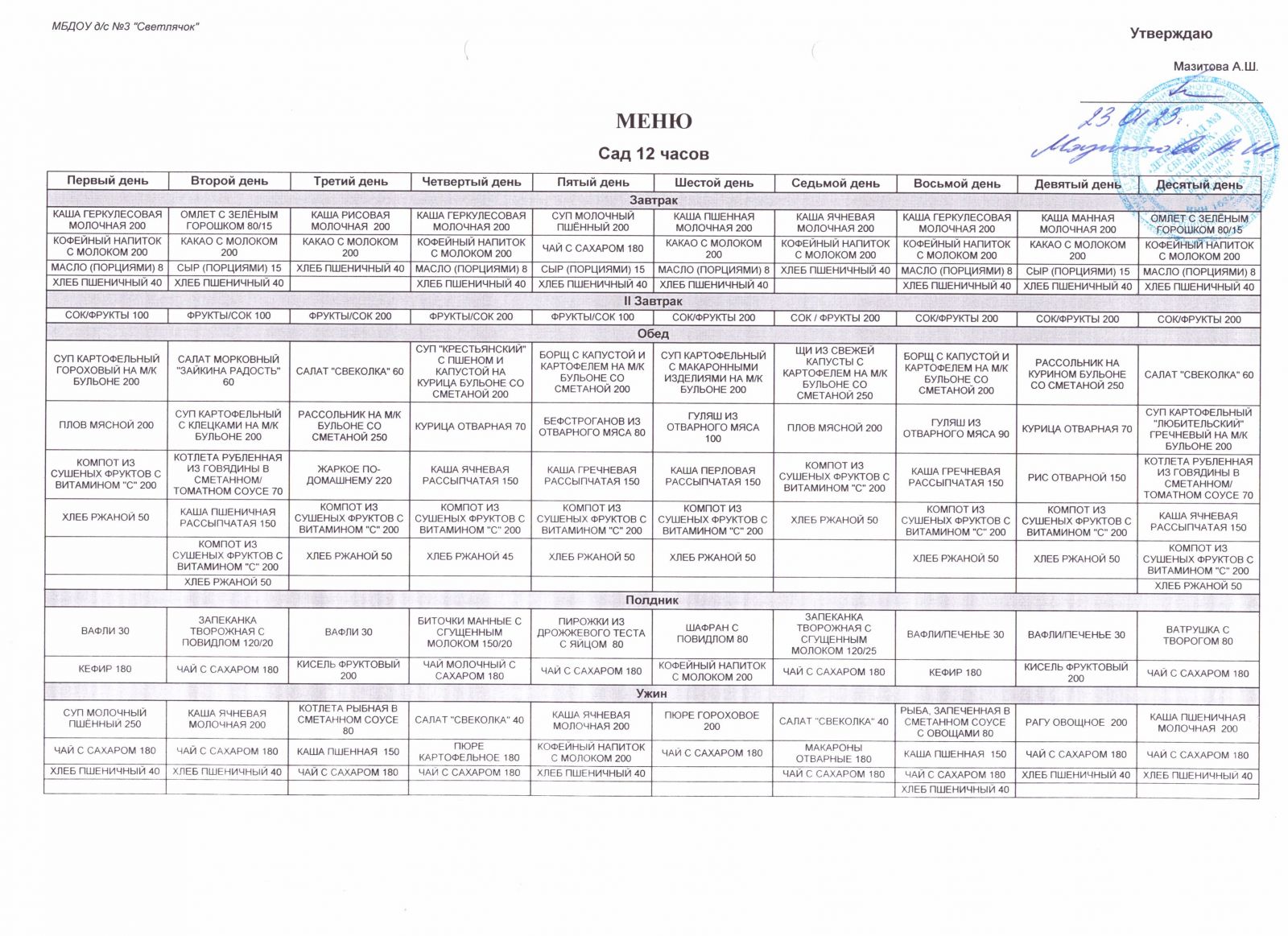 10-ти дневное меню МБДОУ "Детский сад №3 "Светлячок" общеразвивающего вида г.Нурлат РТ"