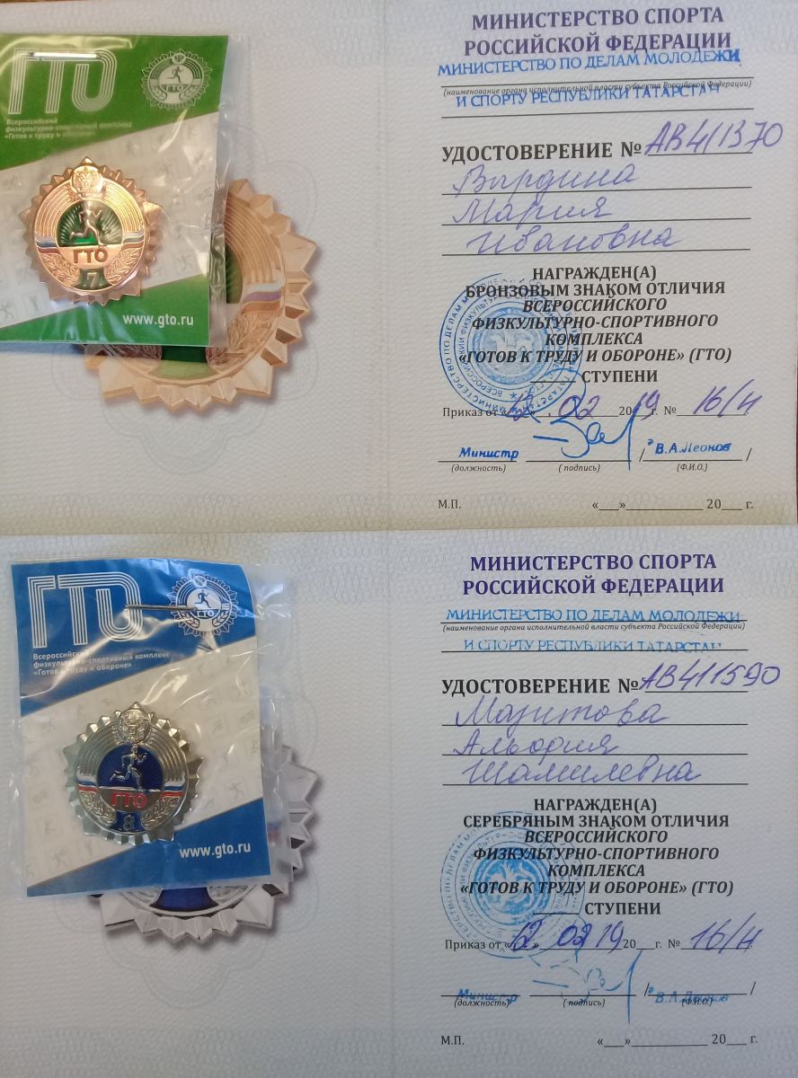 2019 елның 5 апрелендә «Хезмәткә һәм сакланышка әзер " Бөтенроссия физкультура-спорт комплексының аерымлык билгеләре тапшыру буенча тантаналы чара узды. Безнең балалар бакчасы мөдире Мәҗитова А. Ш. һәм шәфкать туташы Борисова Е. А. "ГТО" БФСКның аерымлык билгеләре һәм таныклыгы белән, тәрбияче Вырдина М. И. бронза аерымлык билгесе белән бүләкләнделәр.
