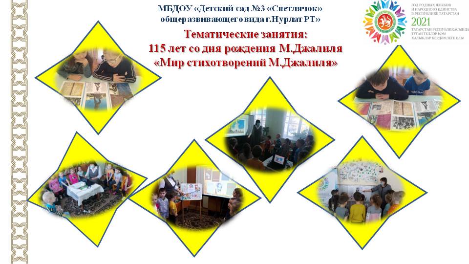 Опубликовано: 16.02.202115 февраля в ДОУ прошли тематические занятия "Мир стихотворений М.Джалиля", посвященные 115-летию со дня рождения М.Джалиля. Воспитанники познакомились с жизнью и творчеством поэта, сборником "Моабитская тетрадь". / 15 нче февраль көнне балалар бакчасында М.Җәлилнең тууына 115 ел тулуга багышланган "М. Җәлил шигырьләре дөньясы" дип исемләнгән тематик дәресләр узды. Тәрбияләнүчеләр шагыйрьнең тормыш юлы һәм иҗаты, "Моабит дәфтәре"җыентыгы белән таныштылар.