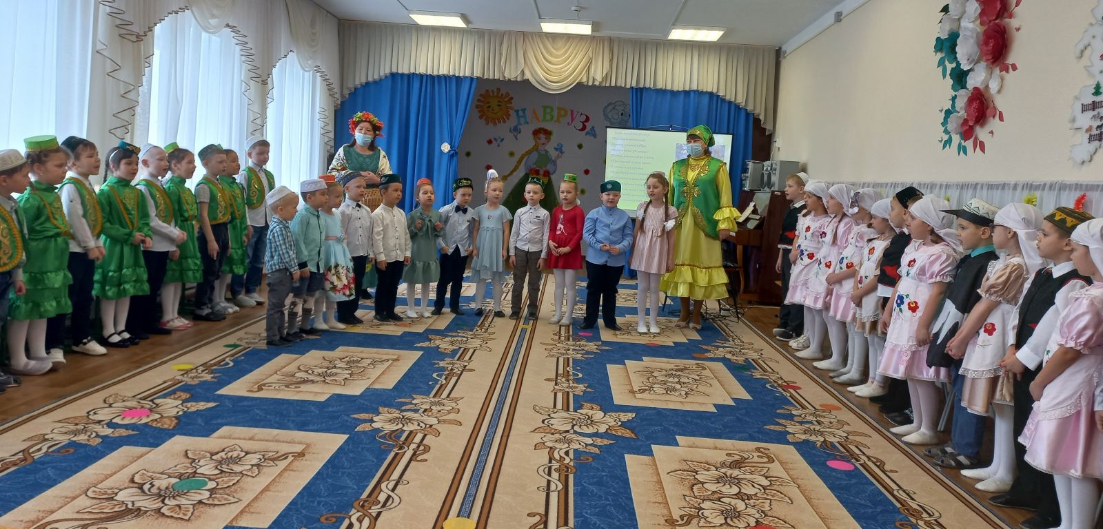 Опубликовано: 21.03.2022Сегодня, 21 марта, в ДОУ прошел праздник Навруз. На празднике воспитанники рассказывали стихи и пели песни на татарском и русском языках, танцевали и играли в народные игры./ Бүген, 21 март көнне, балалар бакчасында Нәүрүз бәйрәме узды. Бәйрәмдә балалар татар һәм рус телләрендә шигырьләр сөйләделәр, җырлар җырладылар, биеделәр һәм халык уеннарында уйнадылар.