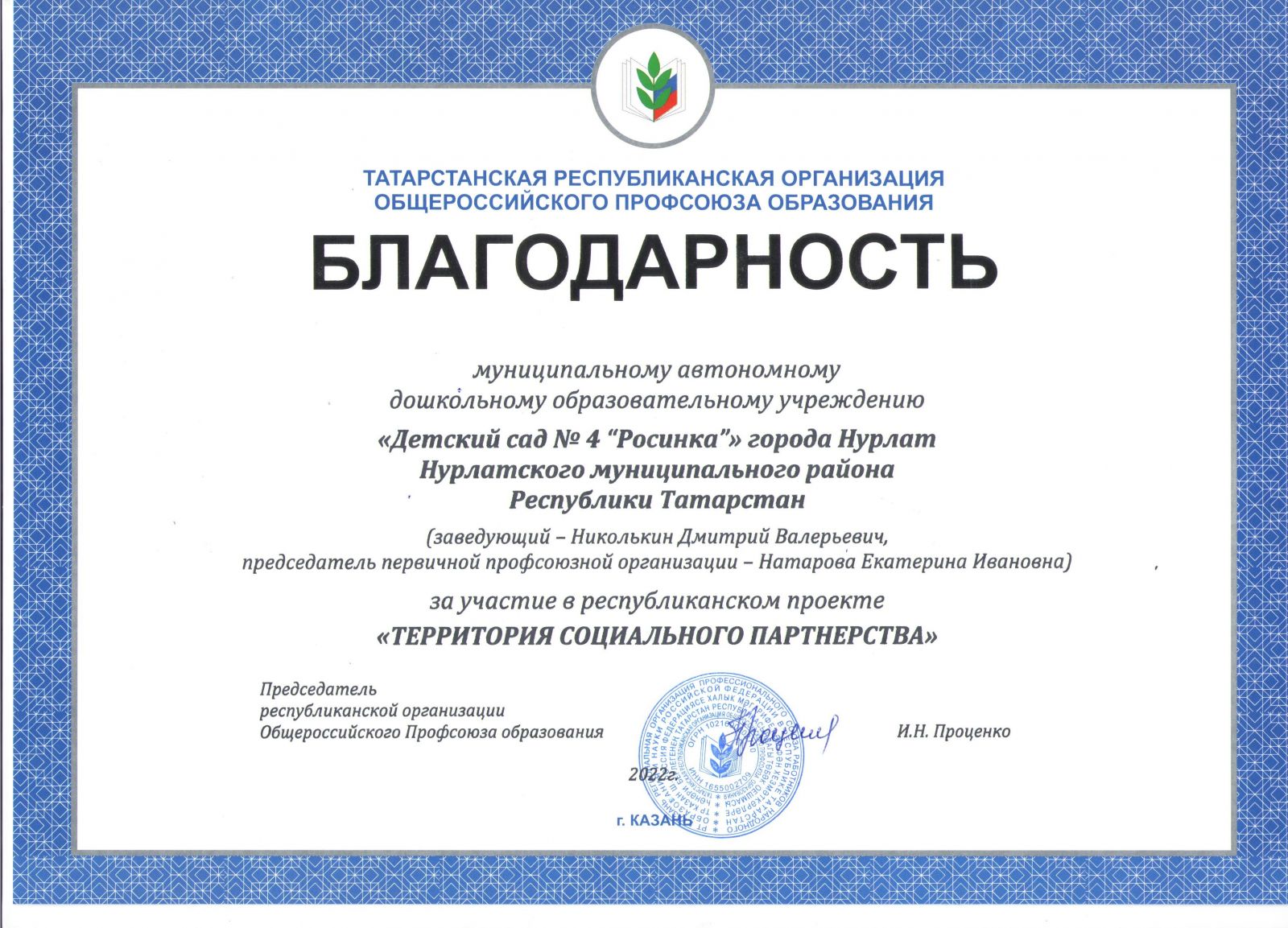 2022 год - Благодарность ТРО Общероссийского профсоюза образования за участие в республиканском проекте «Территория социального партнерства»