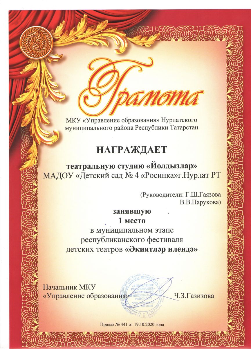 2020 год - Грамота 1 место в Конкурсе театрализованных представлений на татарском языке «Экиятлэр илендэ»