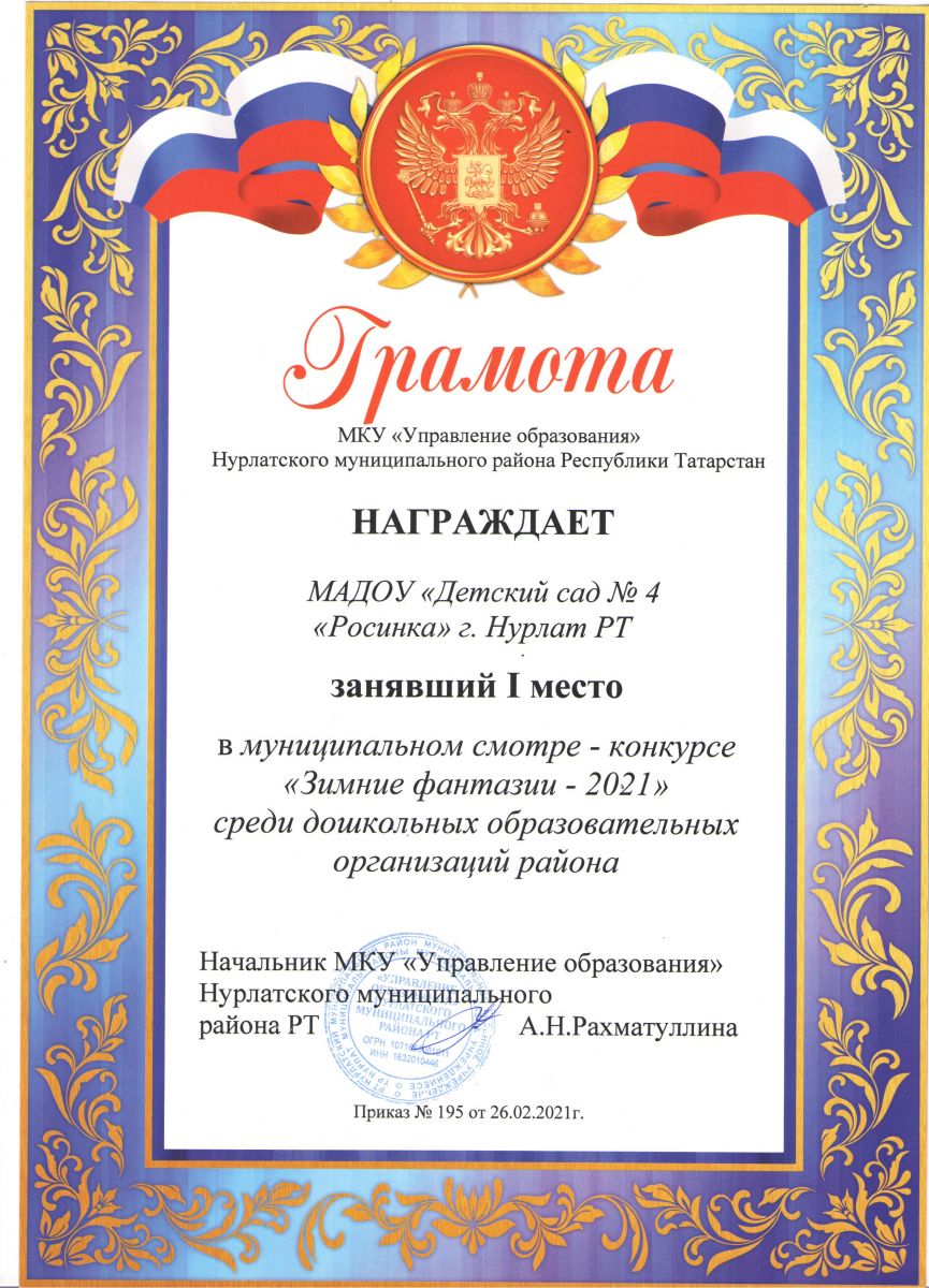 2021 год - Грамота 1 место в муниципальном смотре-конкурсе «Зимние фантазии"