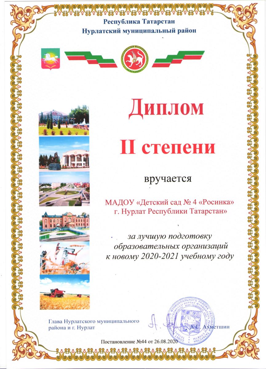 2020 год - Грамота 2 место в Конкурсе на лучшую подготовку образовательных организаций к новому 2020-2021 учебному году.