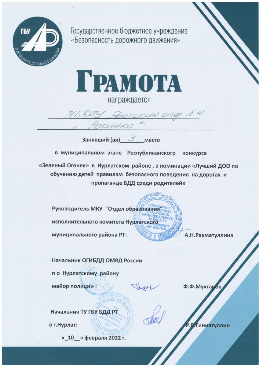 2022 год - Грамота 3 место в муниципальном этапе республиканского конкурса «Зеленый огонек»