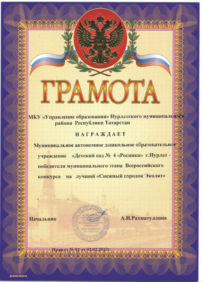2022 год - Грамота победителя в муниципальном этапе Всероссийского конкурса на лучший «Снежный городок Эколят»