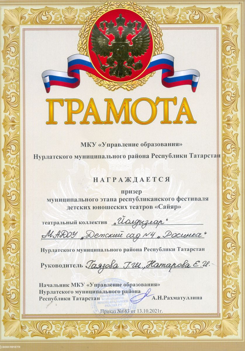 2021 год - Грамота призер муниципального этапа республиканского Фестиваля детских юношеских театров «Сайяр»