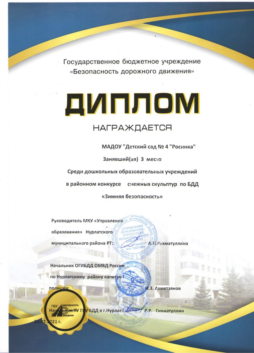 2021 год - Диплом 3 место в районном конкурсе снежных скульптур по БДД «Зимняя безопасность»