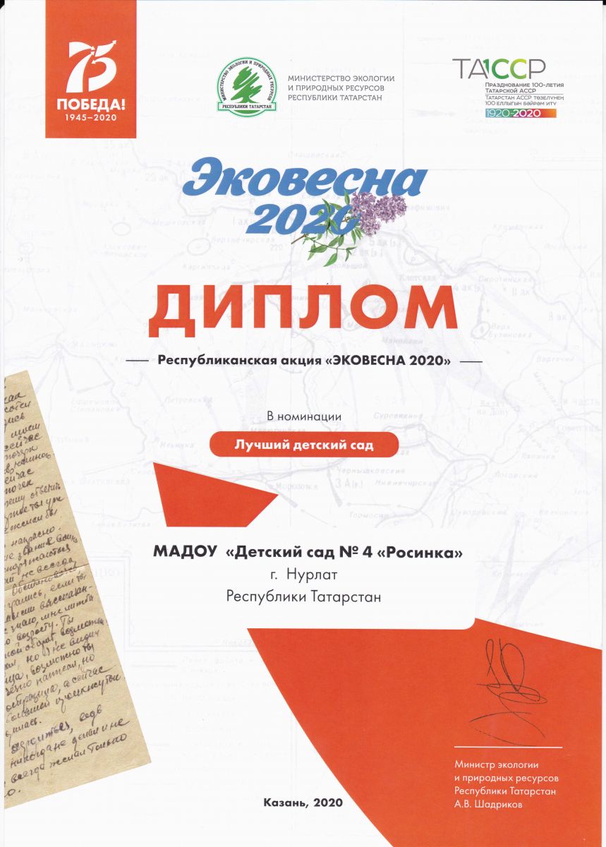 2020 год - Диплом Министерства экологии и природных ресурсов Республики Татарстан - Республиканская акция "Эковесна2020" в номинации "Лучший детский сад"