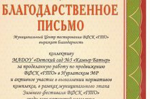 Благодарность за продвижение ВФСК "ГТО" 15.02.2018 Нурлатский центр тестирования ВФСК "ГТО" выразил благодарность детскому саду за активную работу по продвижению ВФСК "ГТО" в Нурлатском муниципальном районе и активное участие в выполнении нормативов комплекса в рамках муниципального этапа зимнего фестиваля ВФСК "ГТО" среди всех категорий населения.