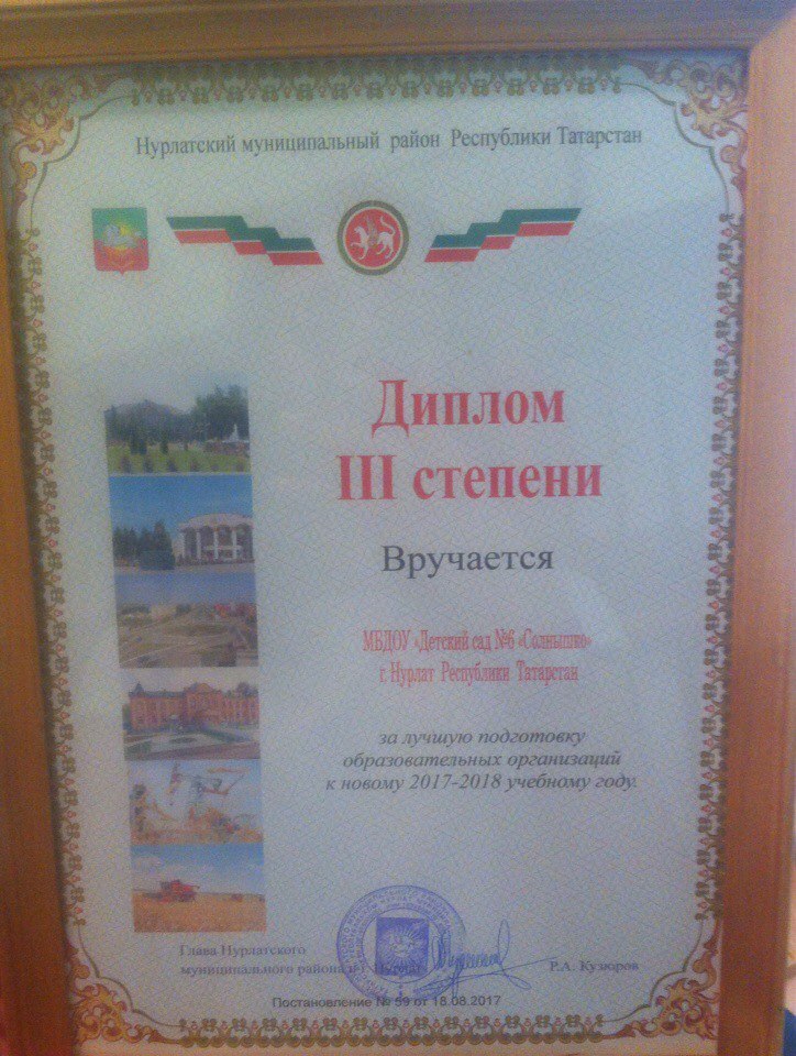 Опубликовано: 04.09.2017Август конференциясендә безнең "Кояшкай" балалар бакчасы яңа уку елына әзерлек буенча 3 урын алды, hәм диплом белән бүләкләнде.