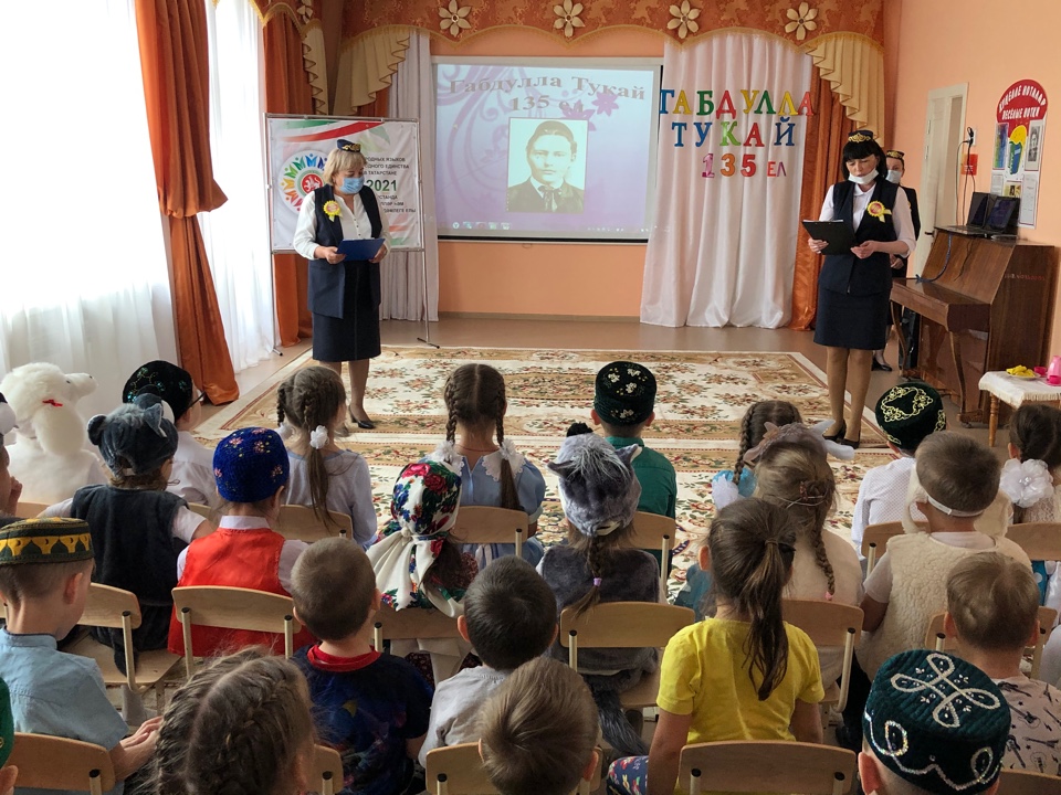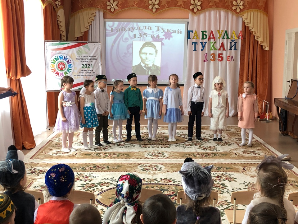 Опубликовано: 23.04.202121 апреля, в честь 135-летнего юбилея Габдуллы Тукая, в рамках "Года родного языка...", в нашем детском саду прошло насыщенное мероприятие, посвященное этому событию. На мероприятии дети читали стихи поэта, инсценировали стихотворения и сказки. Дети познакомились с творчеством Г.Тукая, узнали о его жизни и прекрасных сказочных героях его добрых и поучительных сказок.