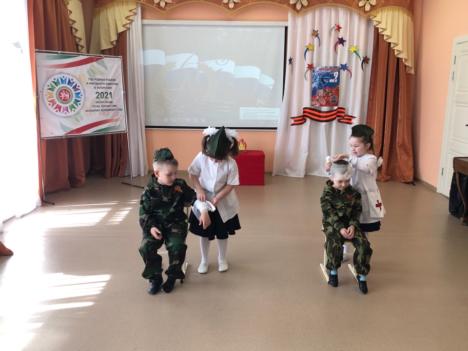 9 Май бәйрәме-ул Бөек Җиңү бәйрәме. Ерак 1941 елда бөтен ил Ватанны саклый һәм тыныч күк астында яшәү хокукын саклый алды. Җиңү Көнендә безнең һәркайсыбыз үз тарихыбыз өчен горурлык хисе тоя...Безнең балалар бакчасында Җиңү көнен бәйрәм итү тантанасы узды: балалар сугыш турында шигырьләр сөйләделәр, Җиңү бәйрәме, тынычлык, солдатлар турында җырлар җырладылар, биеделәр.