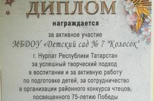 Наш детский сад получил дипломом за активное участие и подготовку детей в конкурсе чтецов, посвященного 75- летию Победы.Безнең балалар бакчасы Җиңүнең 75 еллыгына багышланган нәфис сүз осталары бәйгесендә актив катнашканы һәм балаларны әзерләгәне өчен Диплом белән бүләкләнде. -