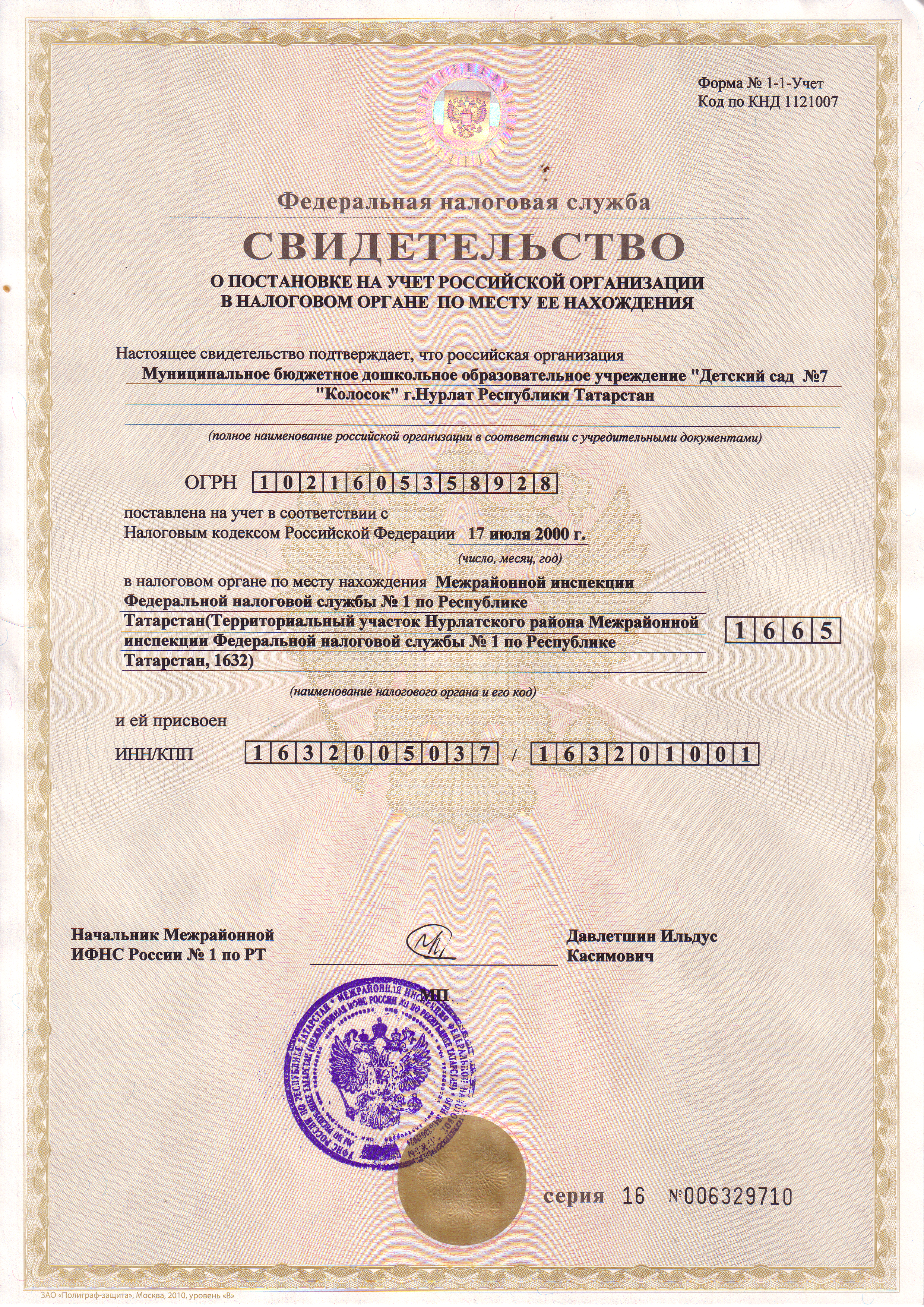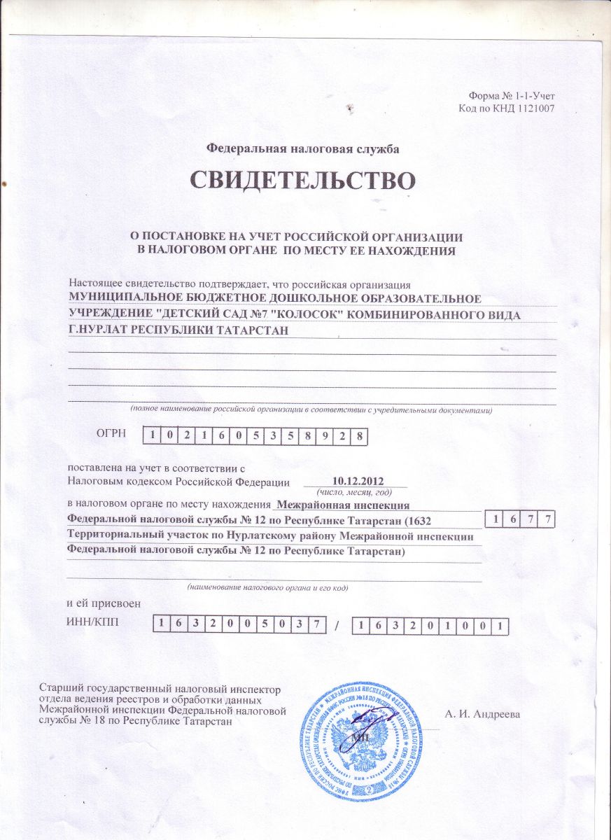 Свидетельство о постановке на учёт Российской организации в налоговом органе по месту её нахождения.BMP