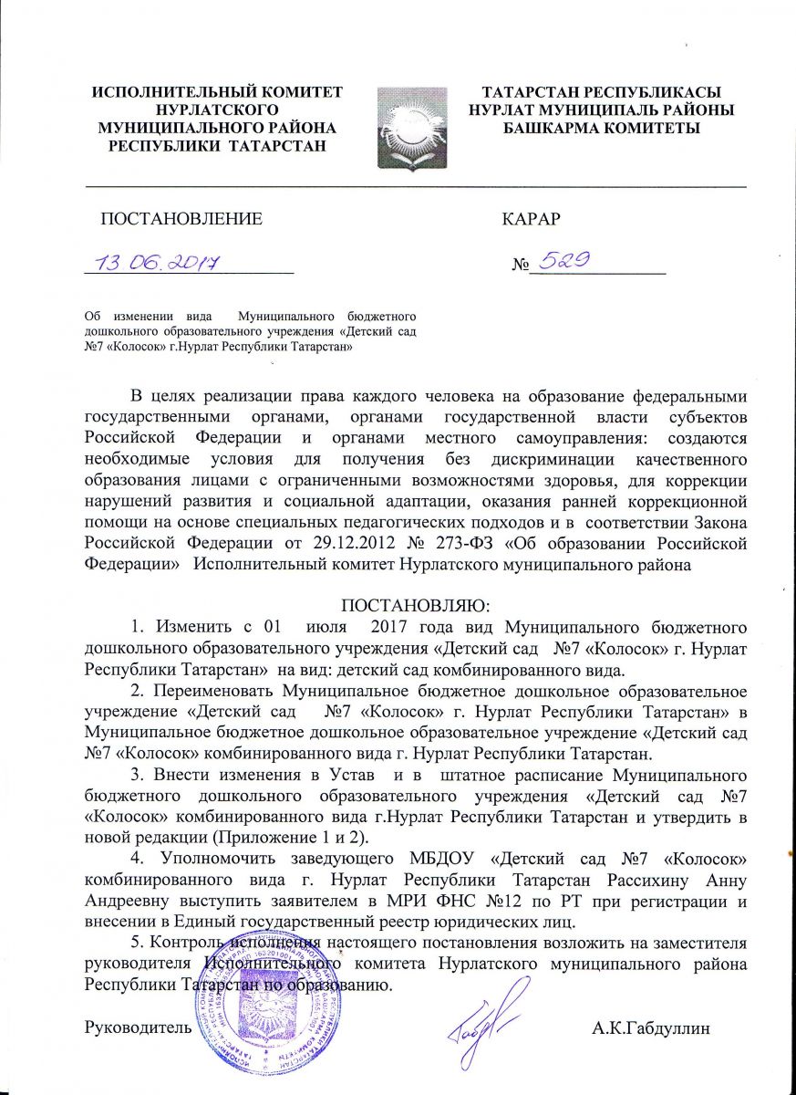 Постановление №529 от 13.06.2017г. Об изменеении вида МБДОУ "Детский сад №7 "Колосок" /upload/storage/org4340/files/Scan10450.JPG