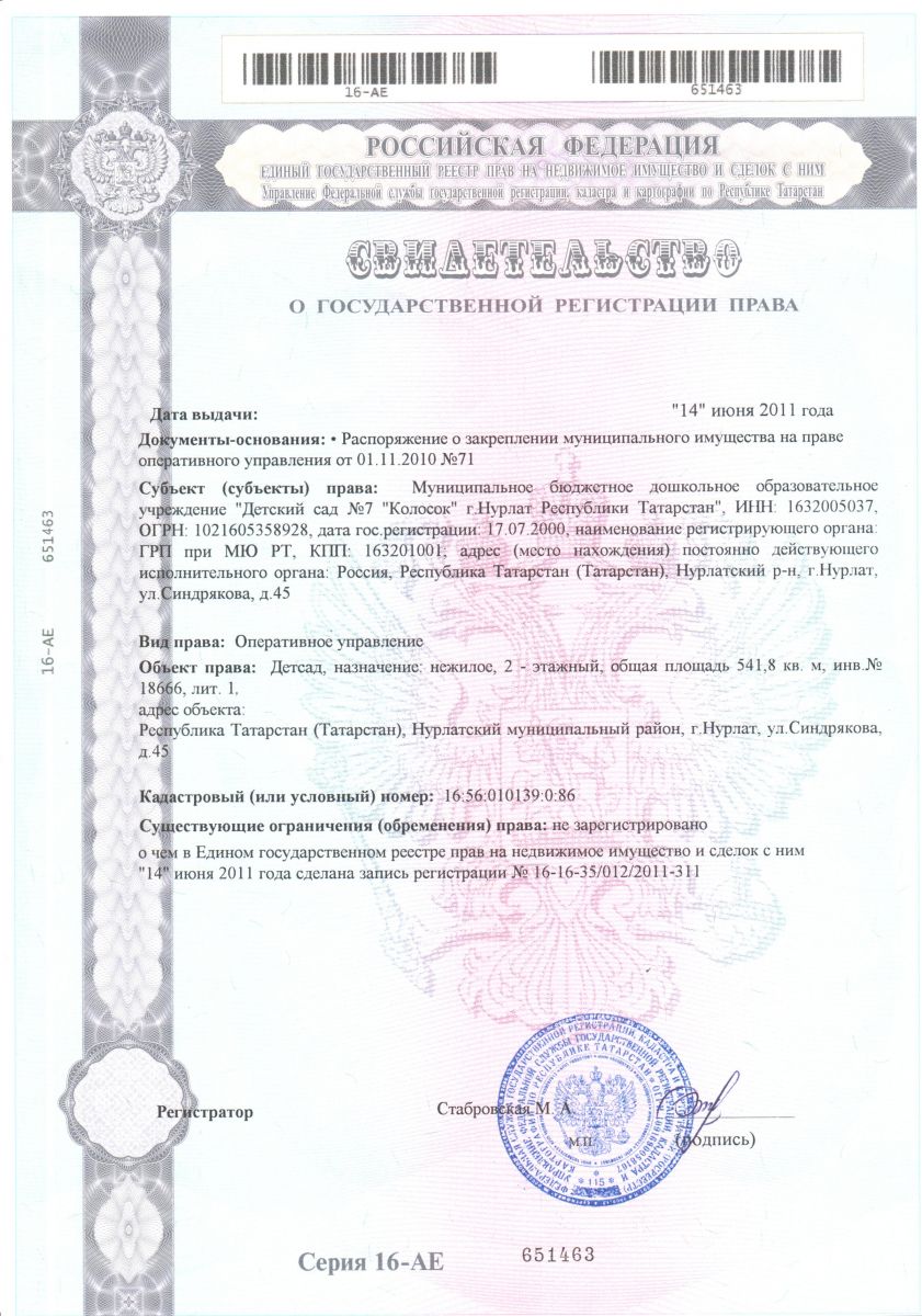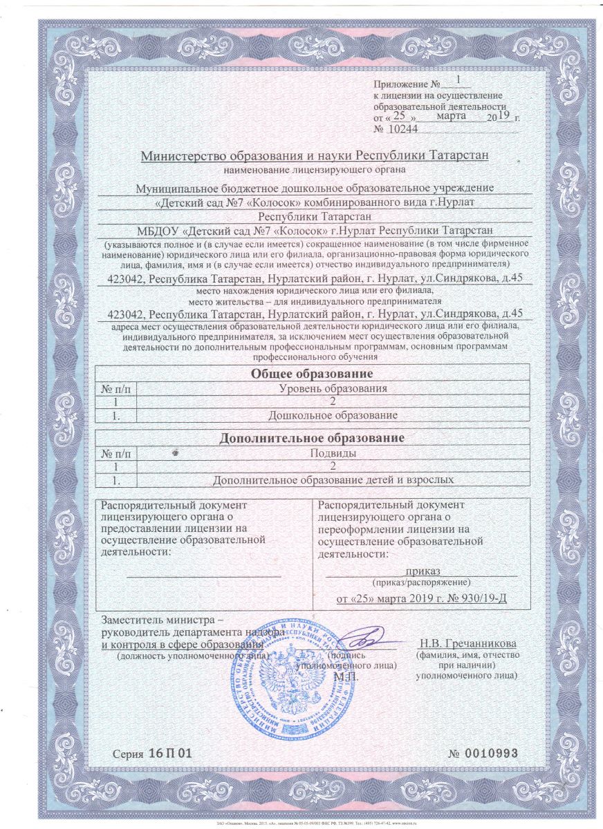 Муниципальное бюджетное дошкольное образовательное учреждение «Детский сад №7 «Колосок» комбинированного вида г. Нурлат Республики Татарстан / Татарстан Республикасы Нурлат шәһәре 7нче номерлы "Башаккай"катнаш төрдәге балалар бакчасы Муниципаль бюджет мәктәпкәчә белем бирү учреждениясе