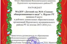 Коллектив нашего детского сада занял 1 место в рейтинге дошкольных учреждений за 15-16 учебный год в Нурлатском районе!!!