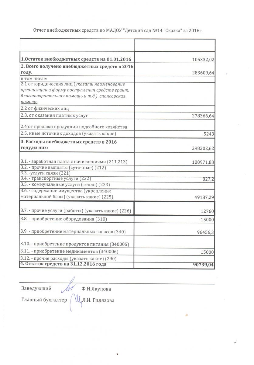 Отчёт внебюджетных средств по МАДОУ Детский сад №14 Сказка за 2016г.