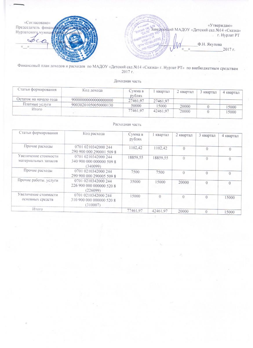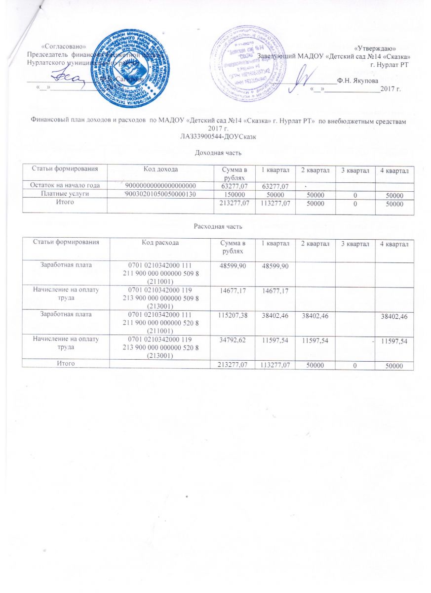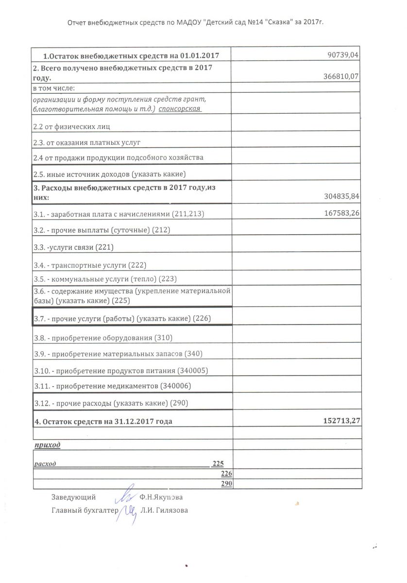 Отчёт внебюджетных средств по МАДОУ Детский сад №14 Сказка за 2017г.