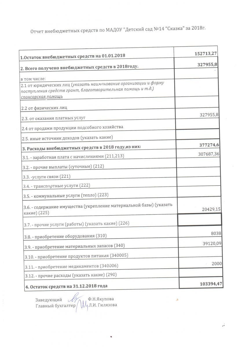 Отчёт внебюджетных средств по МАДОУ Детский сад №14 Сказка за 2018г.