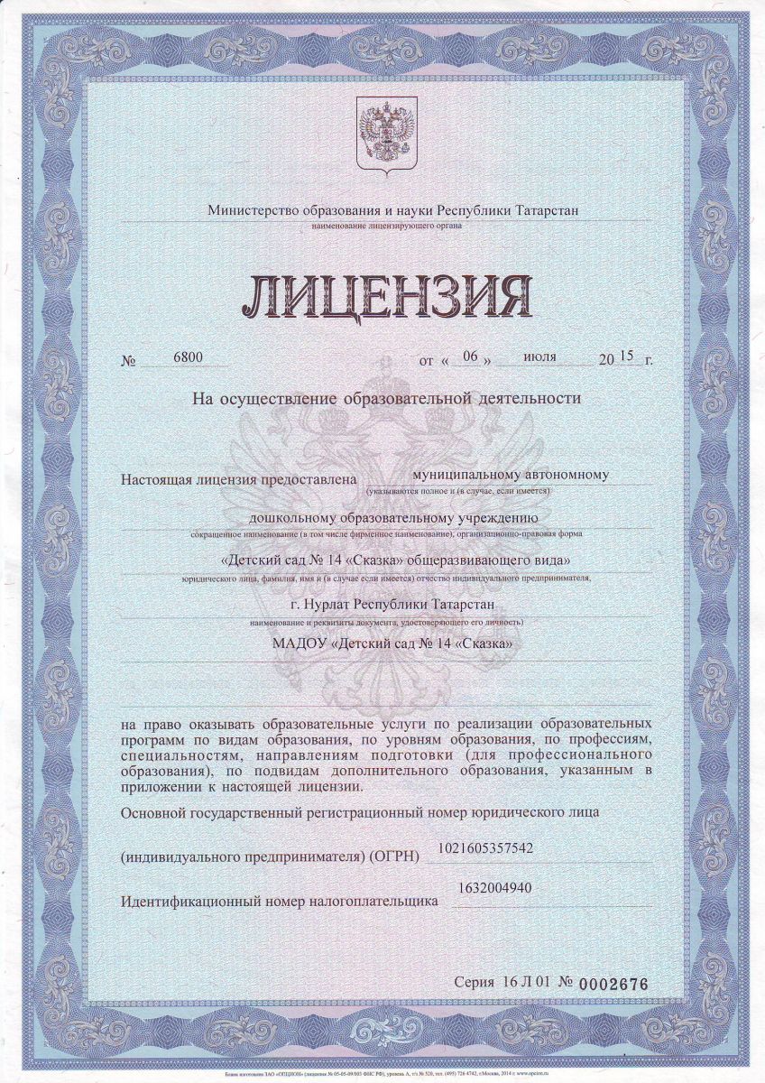 муниципальное автономное дошкольное образовательное учреждение «Детский сад № 14 "Сказка" общеразвивающего вида" г.Нурлат Республики Татарстан./Татарстан Республикасы Нурлат шәһәре «Балаларны һәрьяклап үстерү төрендәге 14 нче номерлы «Әкият» балалар бакчасы» муниципаль автоном мәктәпкәчә белем бирү учреждениесе.