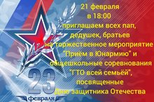 21 февраля в 18.00 приглашаем всех пап, дедушек, братьев на торжественное мероприятие "Приём в Юнармию" и общешкольные соревнования "ГТО всей семьей", посвященные Дню защитника Отечества.