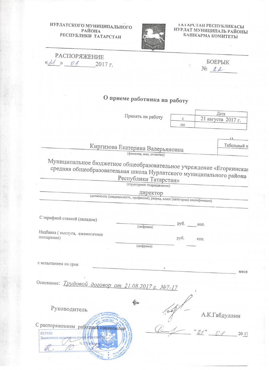Решение о назначении руководителя МБОУ "Егоркинская СОШ"/МБГБУ «Егоркино УГБМ» җитәкче билгеләү турында карар
