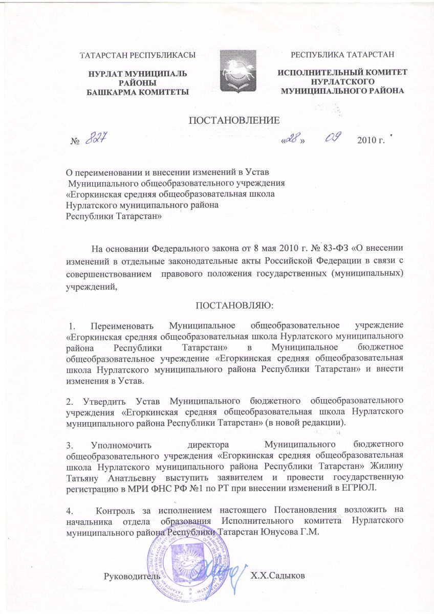 Постановление о переименовании и внесения изменений в Устав МБОУ "Егоркинская СОШ"/ МБГБУ «Егоркино УГБМ» уставына исемен үзгәртү һәм үзгәрешләр кертү турында карар"