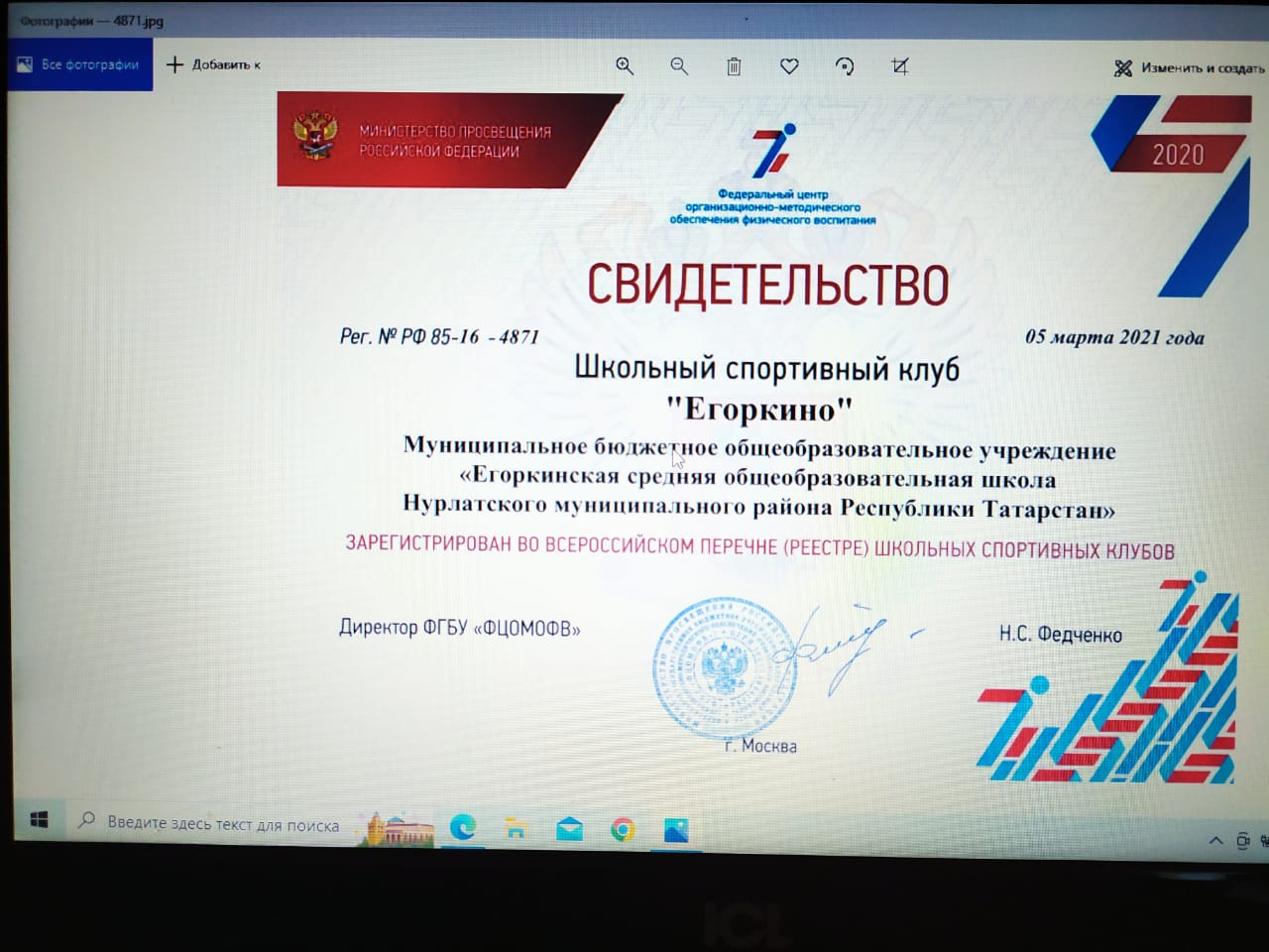 Свидетельство о регистрации во всероссийском перечне школьных спортивных клубов