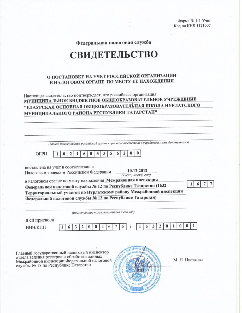 Свидетельство о постановке на учет в налоговом органе
