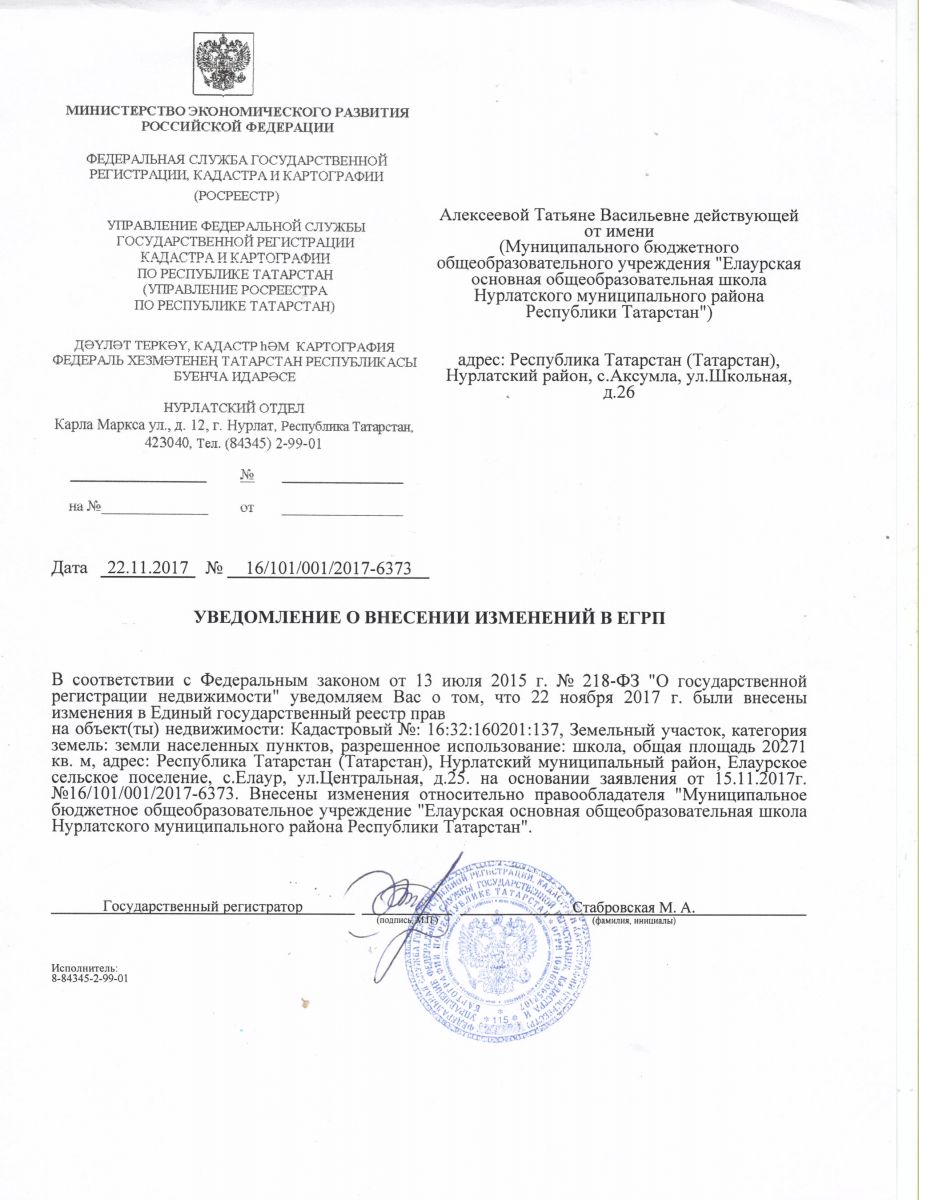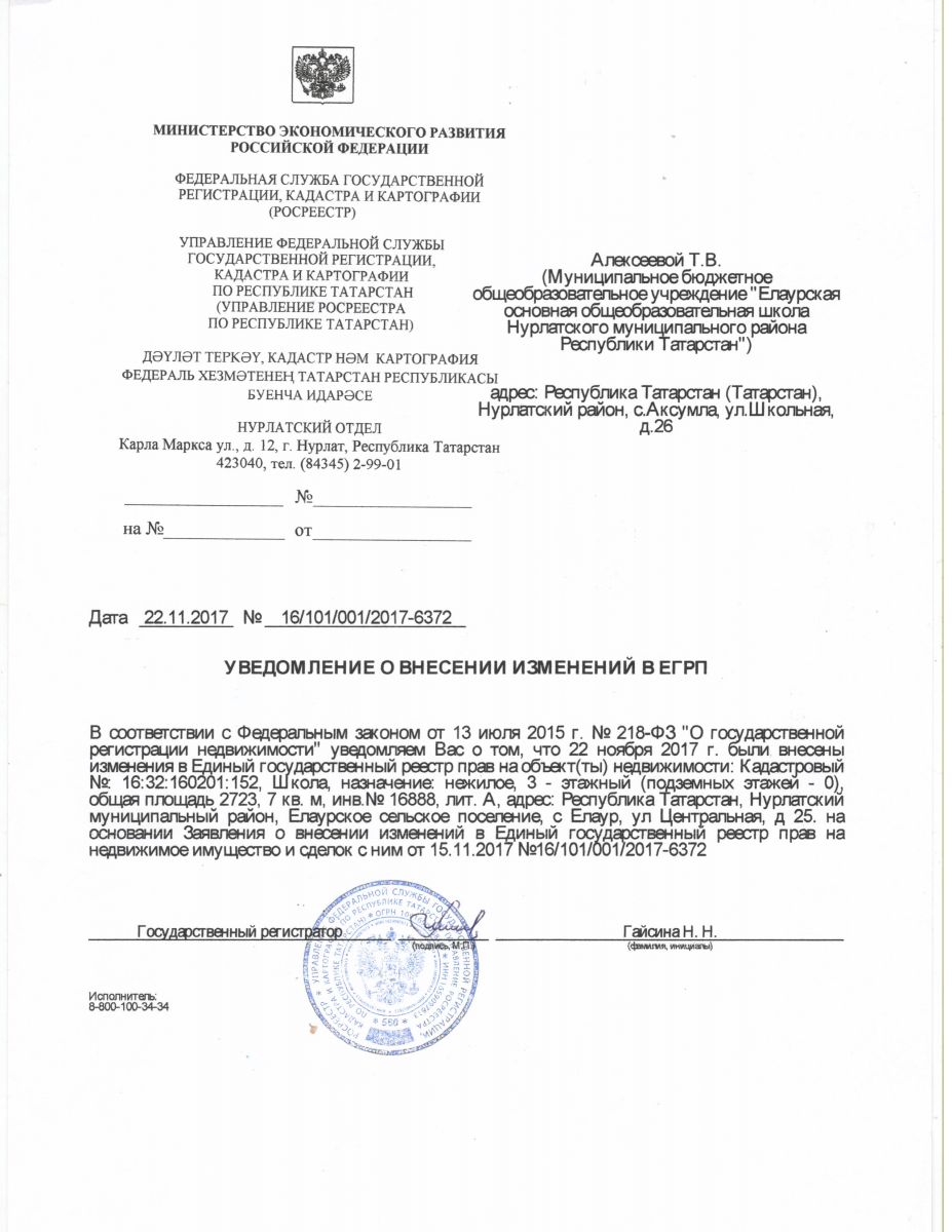 Уведомление о внесении изменений в ЕГРП школа