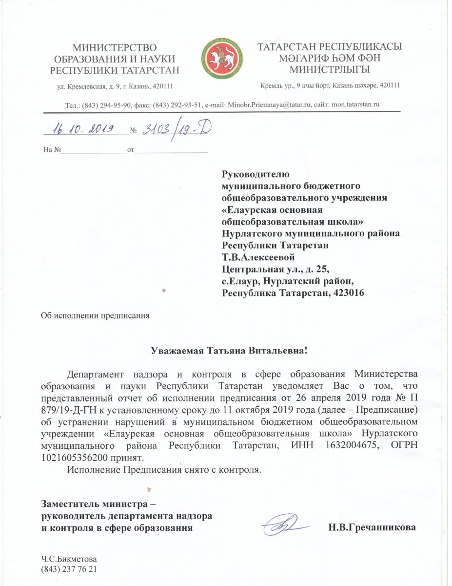 Предписание об устранении нарушений № П 879/19 -Д-ГН от 26.04.2019г.